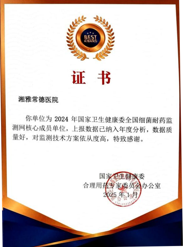 近日,湘雅常德医院在国家卫生健康委医院管理研究所与中国抗菌药物临床应用监测网(CARSS)联合举办的2024年度数据质量评估中脱颖而出,荣获核心网成员数据质量优秀证书。作为湖南省地...