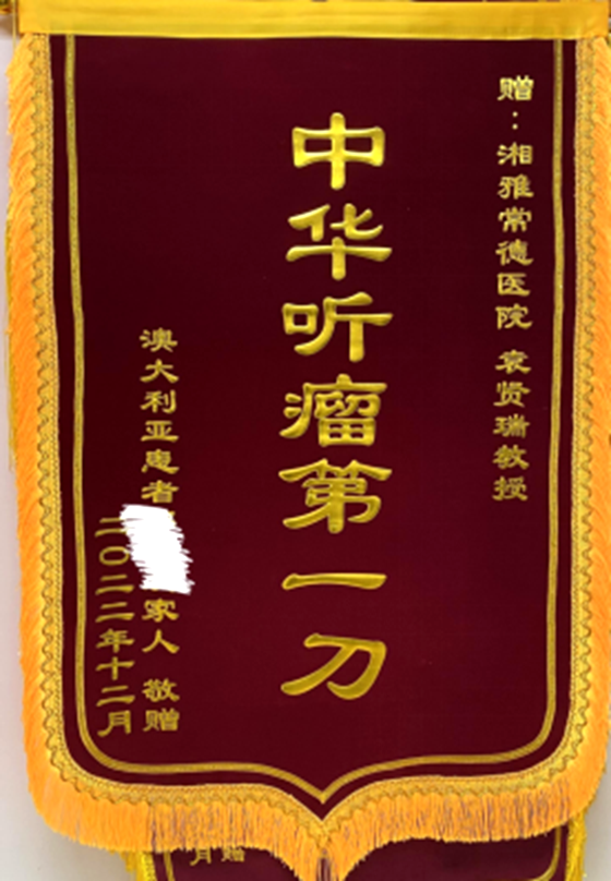 近日,湘雅常德医院神经外科收到一份“沉甸甸”的快递,里面装着的是一面锦旗,“中华听瘤第一刀”七个烫金的大字在红色幕布的映衬下愈发夺目。 “选择回国,选择湘雅...