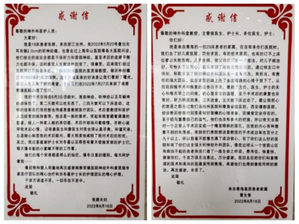 8月16日,湘雅常德医院神经外科同时收到了来自青海西宁和浙江台州的两封特别的感谢信,分别是32岁的曹先生及36岁的张先生。两位年仅30多岁的患者出院时激动的拉着袁贤瑞教授的手,不...