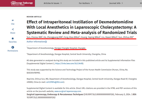 近日,湘雅常德医院麻醉科团队一篇综述性论文在国际期刊《Surgical Laparoscopy, Endoscopy & Percutaneous Techniques》(JCR 4区,IF:1)上发表,论文题目为《Effect of int...