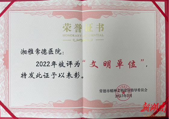 近日,常德市精神文明建设指导委员会下发《关于表彰2022年度常德市文明(标兵)单位、文明(标兵)校园、文明村镇、文明社区、文明窗口单位、文明家庭的决定》,湘雅常德医院荣获2022年度“市级...