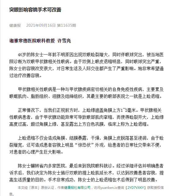 46岁的陈女士一年前不明原因出现双眼睑裂增大,同时伴眼球突出,被当地医院诊断为双眼甲状腺相关性眼病。由于双侧上眼皮退缩明显,同时眼球突出严重,陈女士的容貌改变很大,对日...