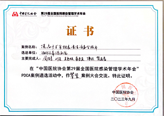 获奖证书 9月17日,由中国医院协会主办的第29届全国医院感染管理学术年会在山西太原圆满落幕,湘雅常德医院手术室案例《提高手术室物表清洁消毒合格率》荣获第五届PDCA案例攀登奖。 ...