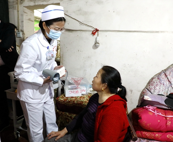 另一端,心血管内科护士饶红敏一边给大家量血压、测血糖,一边将日常药品递交到他们手里,“大妈,您的这个病得长期服用这些药!”饶红敏亲切地交代着。