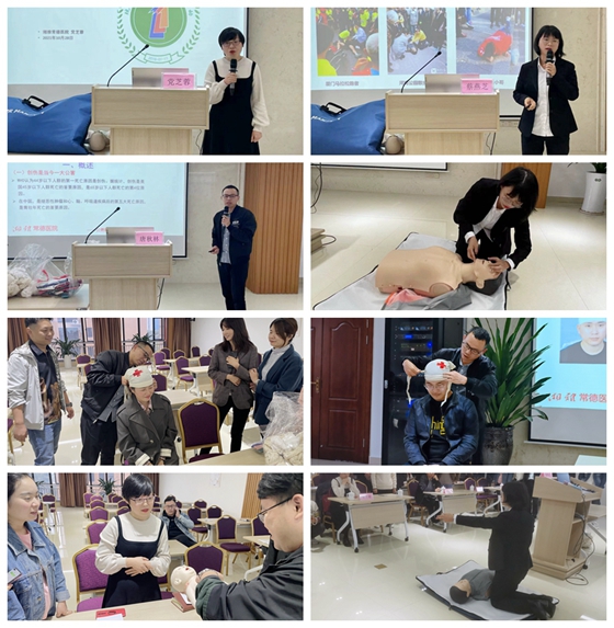 活动中,我院培训团队专家分别以理论授课和实际操作相结合的方式,向参训职工讲解“现场救护‘三个一’理念”、“心肺复苏”、“创伤现场救护”、“气道异物梗阻”等现场救护知识,并现场进行手把手教学的操作练习。整场培训内容实用、丰富,活动形式生动活泼,让大家身临其境的感受争分夺秒的抢救现场。